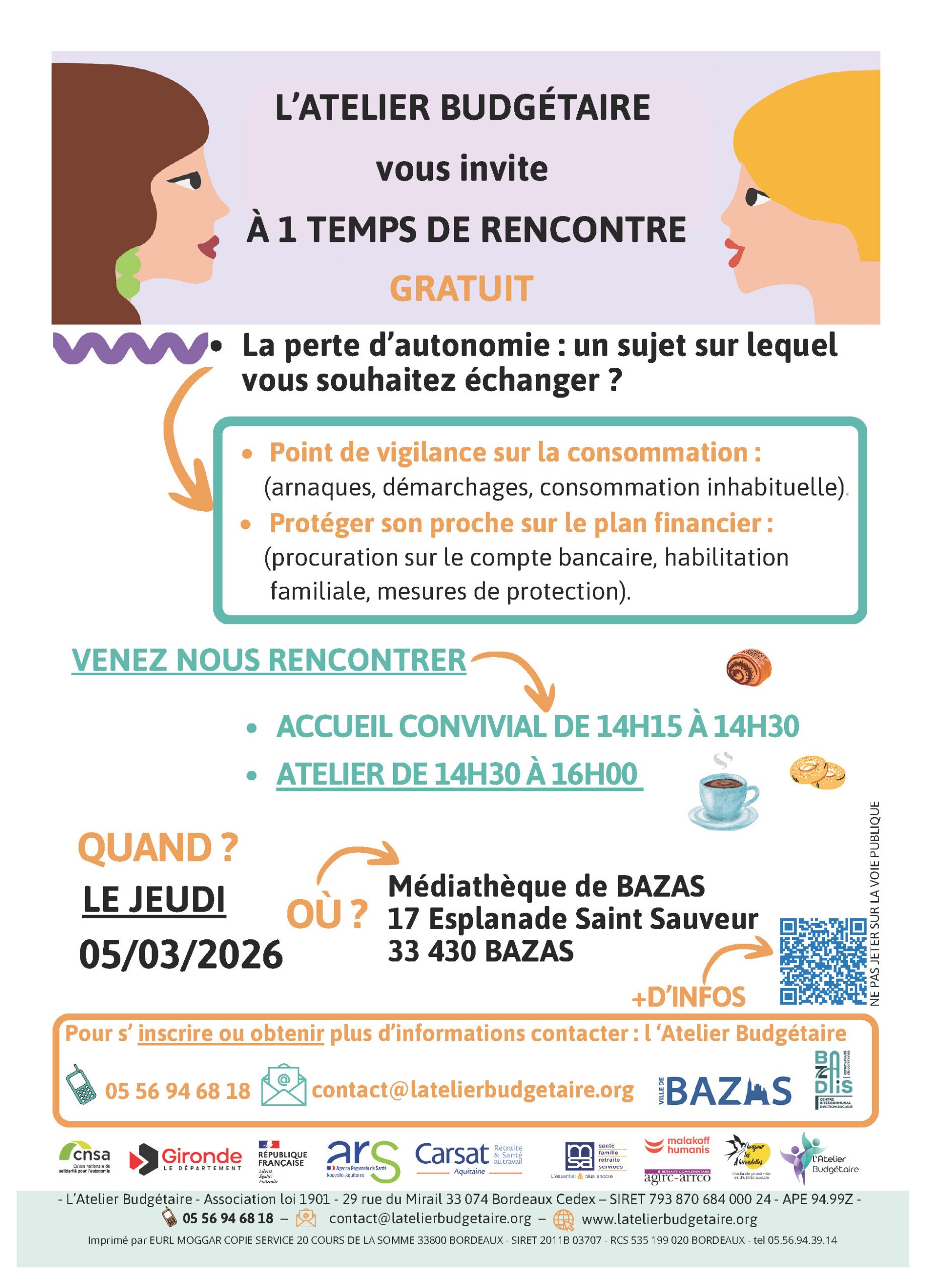 Dans le cadre de son action de prévention et d’accompagnement des habitants, le CIAS du Bazadais, en partenariat avec la ville de Bazas, s’associe à l’Atelier Budgétaire pour proposer une série d’ateliers/rencontres gratuits à destination du public.