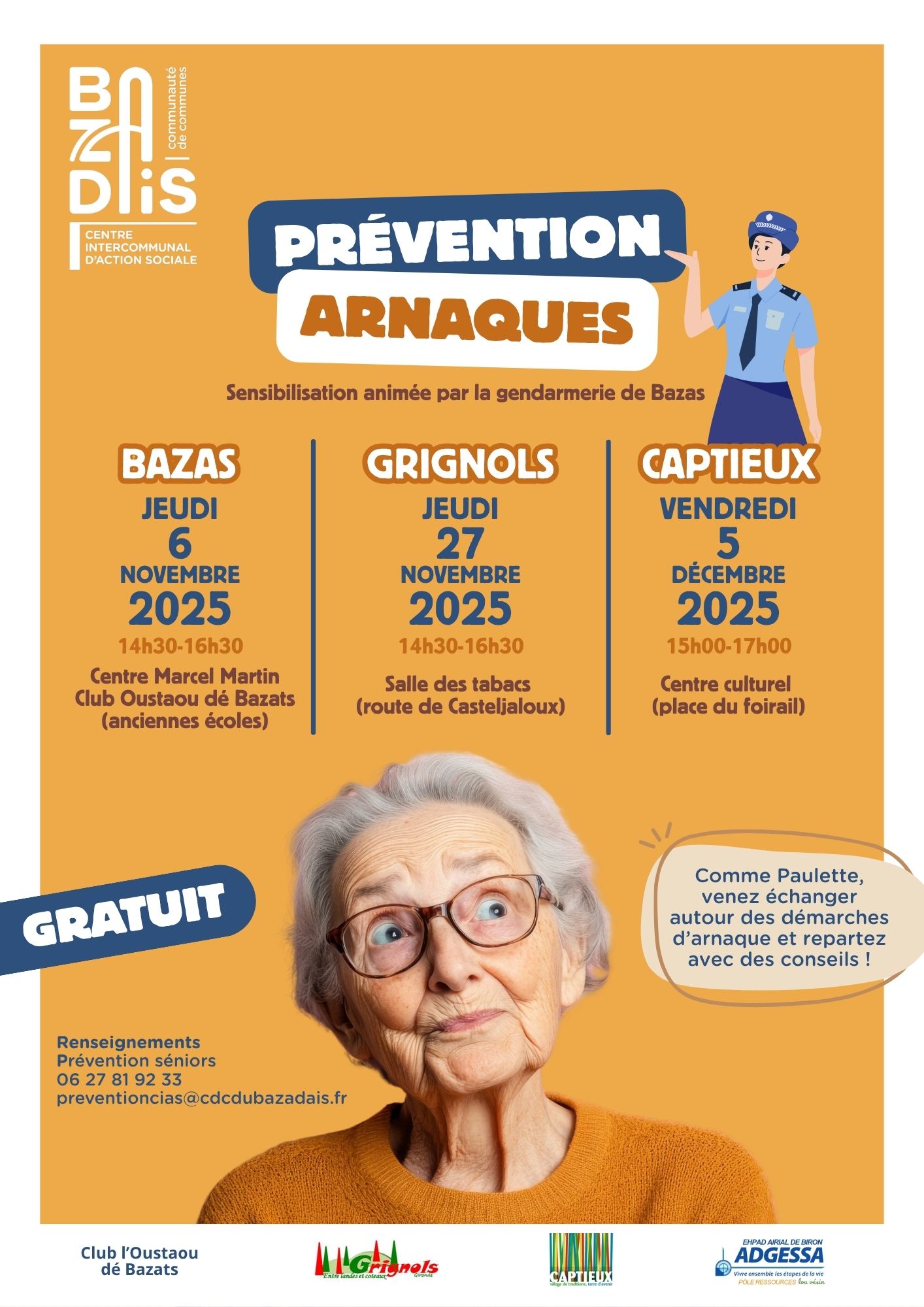 Le Centre Intercommunal d’Action Sociale du Bazadais, à travers son service prévention, organise en partenariat avec la gendarmerie de Bazas trois réunions d’information sur la sécurité des seniors.